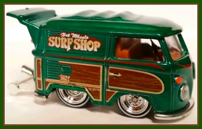 a) Spectraflame green body with "Surf Shop" deco, Malaysia base and chrome hub Real Riders |