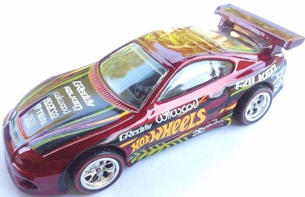 a) Spectraflame burgundy body with "GReddy" deco, Malaysia base and chrome/black hub Real Riders |
