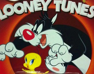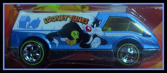 a) Metalflake blue body with Sylvester & Tweety deco, metal base and chrome hub yellowline Real Riders |